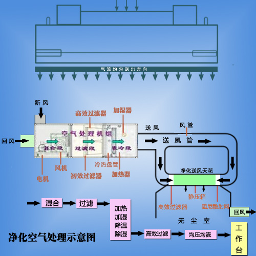 外氣先通過MAU(外氣進行首次過濾)進入無塵室頂部,再通過FFU(二次過濾)將風(fēng)送進無塵室內(nèi),送下來的風(fēng)通過高架地板,再進入回風(fēng)箱送到無塵室頂部。