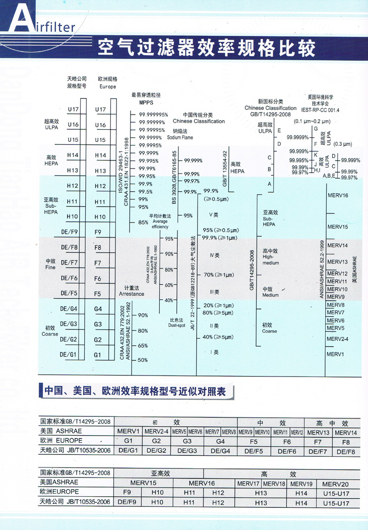 國內(nèi)外最新空氣過濾器效率規(guī)格表: 國內(nèi)外最新空氣過濾器效率規(guī)格表包括國標(biāo),美標(biāo),歐標(biāo)三種國際標(biāo)準(zhǔn)